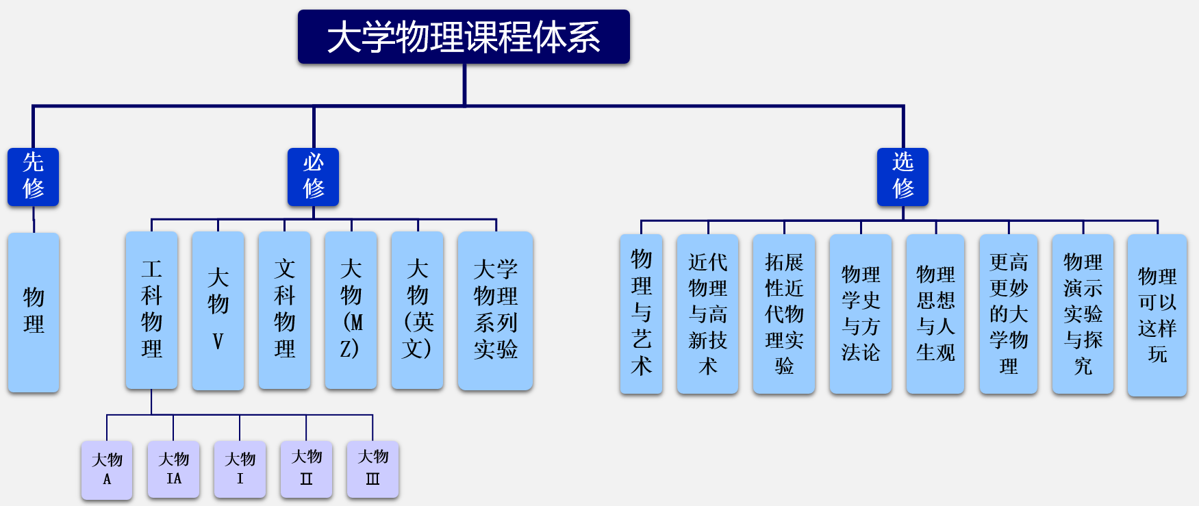 大学物理教学与研究中心的前身可追溯到建校初期的基础部物理教研室,在老一辈教师的带领下,形成了严谨治学、精心从教、勇于创新的高尚师德风范,对今后物理学科和大学物理教学的发展奠定了重要基础;此后在施大宁教授等教师的带领下,团队贯彻通识教育理念,建构多维学习情境,对 “大学物理”课程进行了全方位的改革和建设。目前我校大学物理课程由先修、必修和后续选修课组成,形成了以物理教育为基础,培养科学与人文素质、提高创新能力为特色的较为完备的课程体系(图1)。