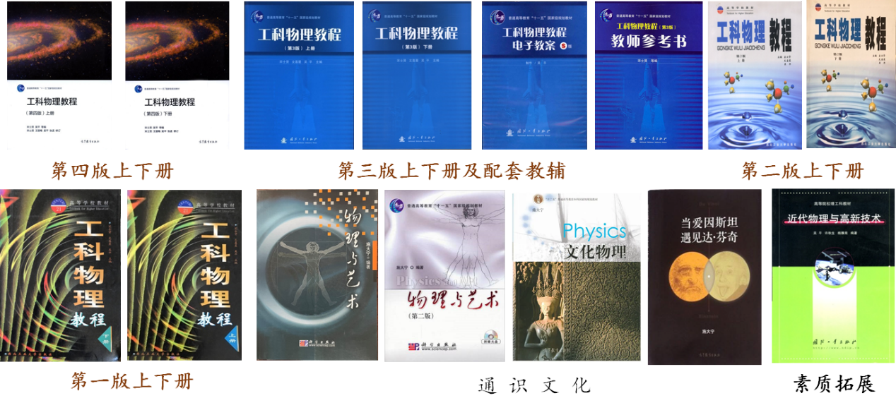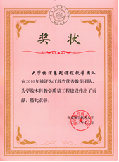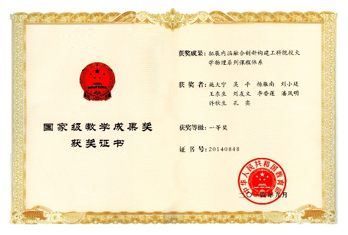 通过几代人的努力,中心取得丰富的建设成果。大学物理课程被评为江苏省精品课程;在课程建设的同时,团队也重视配套教材的建设(图2)。《工科物理教程》在如何加强物理基础、凸显教材的时代气息和工科物理特色、习题作业改革、增强教材的趣味性等方面皆作了一些大胆的探索和尝试;《物理与艺术》等教材更是开创了国内物理类素质教育先河,在全国有很强的示范引领作用。另外,我们格外重视基层教学组织建设,2010年大学物理教学团队被评为江苏省优秀教学团队。系列工作得到广泛认可,2011年获江苏省教学成果特等奖,《拓展内涵 融合创新 构建工科院校大学物理系列课程体系》荣获2014年国家级教学成果一等奖(图3)。在这个过程中涌现出万人计划教学名师施大宁教授,江苏省教学名师杨雁南教授等先进人物。