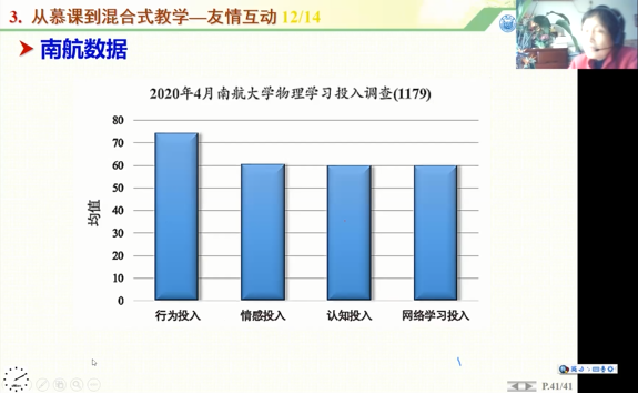 在本次线上分享交流的前一周,理学院依据科罗拉多学习态度量表设计了物理学习投入的调研问卷,问卷涉及学生对一般问题的解决能力、解题信心、对复杂问题的解决能力、个人兴趣、与现实生活的联系、意义理解、概念理解、概念应用等八个维度,并收回了1179份有效问卷。王祖源教授分析了此次调查问卷的数据,肯定了我校学生在线上教学阶段对物理学习的积极投入。