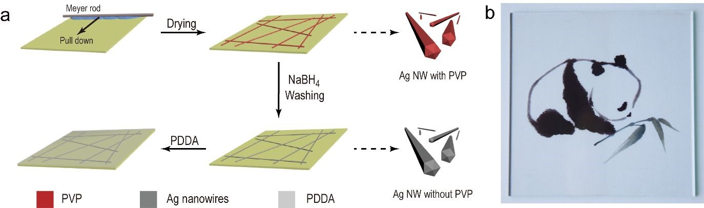 近日,我院应用物理系在该研究方向取得新进展。在实验上展示出大尺寸透明银纳米线导电薄膜,其可见光透过率超过90%,屏蔽效能可达到31.3 dB,为推进实用化奠定了基础。