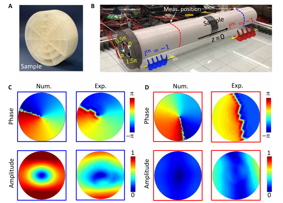 图:不对称声涡旋传输的实验验证;(A)制备的超构光栅;(B)实验装置图;拓扑核为的声涡旋从左侧(C)和右侧(D)入射数值模拟和实验测量的透射相位和振幅;