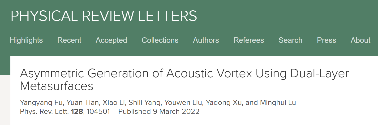 近日,我院应用物理系伏洋洋副研究员和刘友文教授与苏州大学的徐亚东教授、南京大学的卢明辉教授等合作,利用双层超构表面中的单向轨道角动量转化机制,首次提出一种涡旋声场非对称产生的新现象和物理机制。相关成果以 “Asymmetric generation of acoustic vortex using dual-layer metasurfaces”为题发表在物理学权威期刊《Physical Review Letters》上。伏洋洋副研究员为论文的共同通讯作者和第一作者,苏州大学的徐亚东教授和南京大学的卢明辉教授为论文的共同通讯作者。