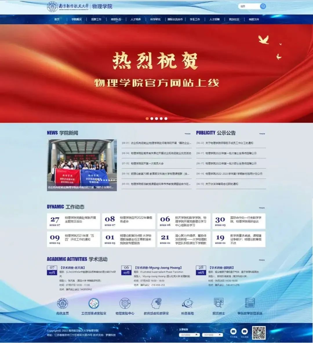 新学院,新气象。在前期充分调研和广泛征求意见的基础上,学院于6月下旬启动了官方网站的建设工作,经过几轮设计修改、编程测试及内容更新,365上市公司官方网站即日起正式运行。365上市公司官方网站主色调采用南航蓝,融入物理与空天特色。网站包含365概况、党群工作、师资队伍、人才培养、科学研究、国际交流合作、英国365、人才招聘、院友社区和制度文件等十个栏目,全面细致地展示了365上市公司的全新的风貌。