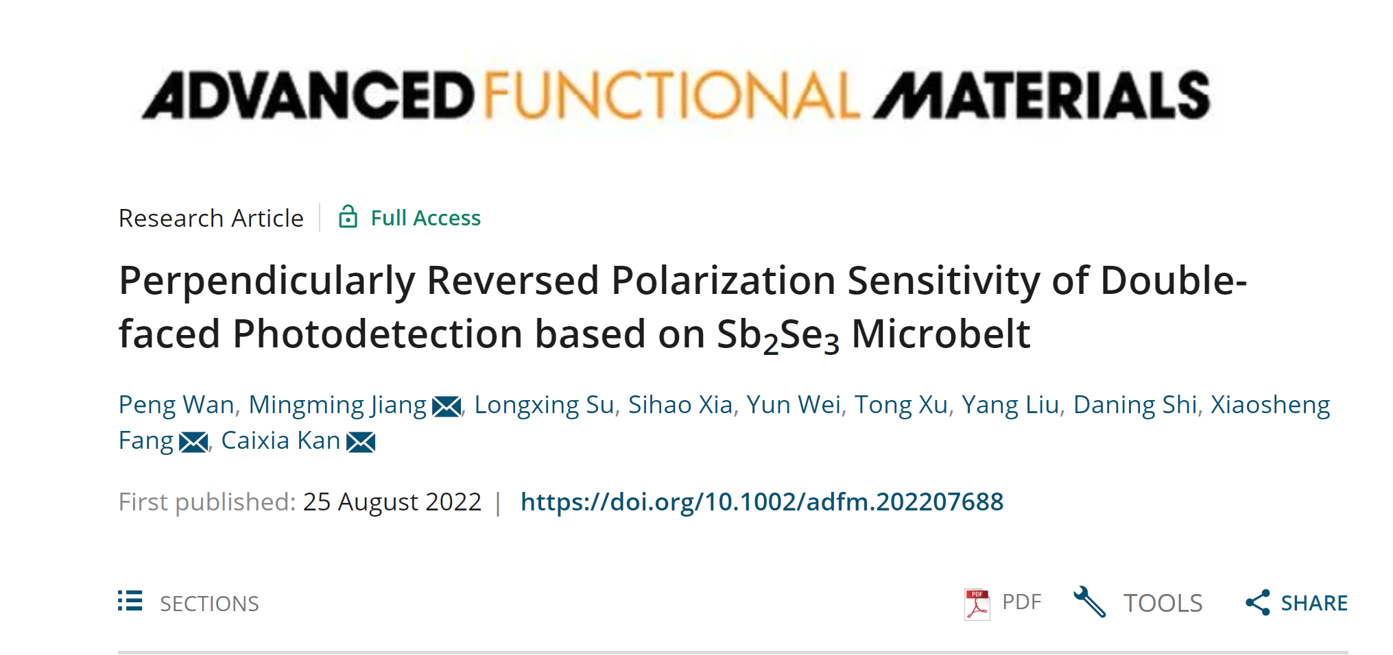 针对上述问题,英国365上市公司阚彩侠教授团队与复旦大学方晓生教授、南方科技大学苏龙兴教授合作,通过化学气相沉积法生长出高结晶质量的硒化锑(Sb2Se3)微米带,并成功实现了基于Sb2Se3微米带的双面偏振探测器。Sb2Se3微米带的偏振探测器从宽的辐照面到窄的辐照面,偏振敏感性出现了明显的垂直反转。相关研究成果以“Perpendicularly Reversed Polarization Sensitivity of Double-faced Photodetection based on Sb2Se3 Microbelt”为题于2022年8月25日发表在Advanced Functional Materials上。