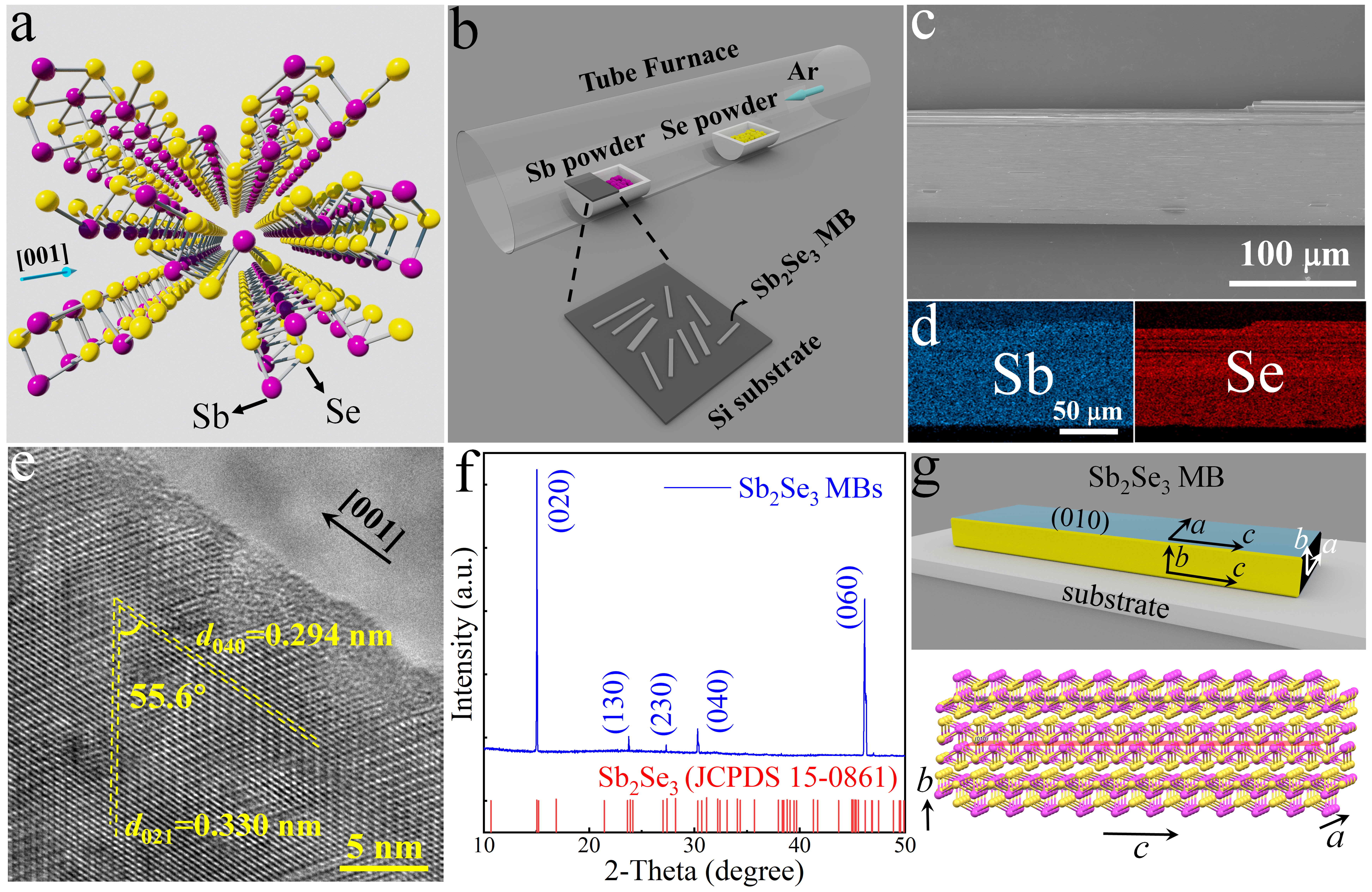 如图1所示,采用化学气相沉积法合成了高结晶质量的一维Sb2Se3微米带。以MXene为对称电极,制备出光电导型探测器件。探测器表现出良好的近红外探测性能,最大光响应波长位于~1050 nm,并具有良好的重复性和较快的光响应速度。角分辨拉曼谱揭示了Sb2Se3微米带在三个轴向上的非对称性和各向异性,与拉曼张量的理论预测一致。