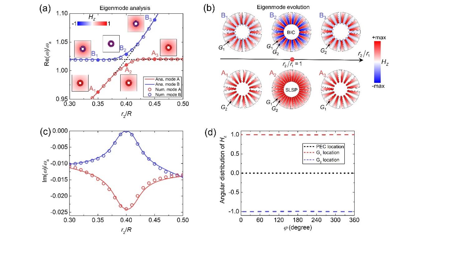 研究团队基于人工局域表面等离激元(SLSP)结构[PRL 108, 223905 (2012)],通过改变凹槽深度打破近邻槽的对称性,揭示了基于SLSP人工金属结构实现BIC的新思路。图1a为结构示意图,两个不同深度的槽(G1和G2)交替排列在金属圆柱表面,其中G1槽尺寸不变(r1 = 0.40R),而G2槽深(r2)可变化。当TM(磁场沿z方向)平面波入射到2D结构上,通过散射截面的解析计算(图1b)可以看到两个散射峰的反交叉行为。高频模式的线宽较窄(高Q共振),低频模式的线宽较宽(低Q共振)。当r2 = 0.40R时(结构具有对称性),高频带线宽消失,散射谱中只能看到SLSP共振。由于BIC的线宽为零,以往的SLSP研究忽略了这类结构中还存在BIC。进一步地,模拟结果验证了理论解析的准确性(图2a),且准BIC的比传统的SLSP有着更好的场增强效果(图2c),这在传感器、激光器和非线性光学中具有重要的应用价值。图2c展示了了最低阶三个角动量通道(OAM)的高Q共振的本征频率演变情况,在r2 = 0.40R处三个模式都是BIC(图2d)且完全简并。这种完全简并行为是由于金属结构的极端各向异性引起的,使得所有通道的BIC的径向共振都坍缩到最低阶模式,但它们的角向特性依旧保留。