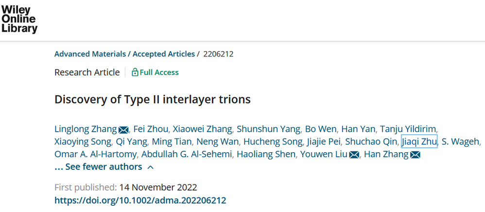 近日,国际顶级期刊《Advanced Materials》(先进材料,IF:32.09)在线发表我校365上市公司团队的研究成果“发现II类层间三激子”。南航为第一通讯单位。