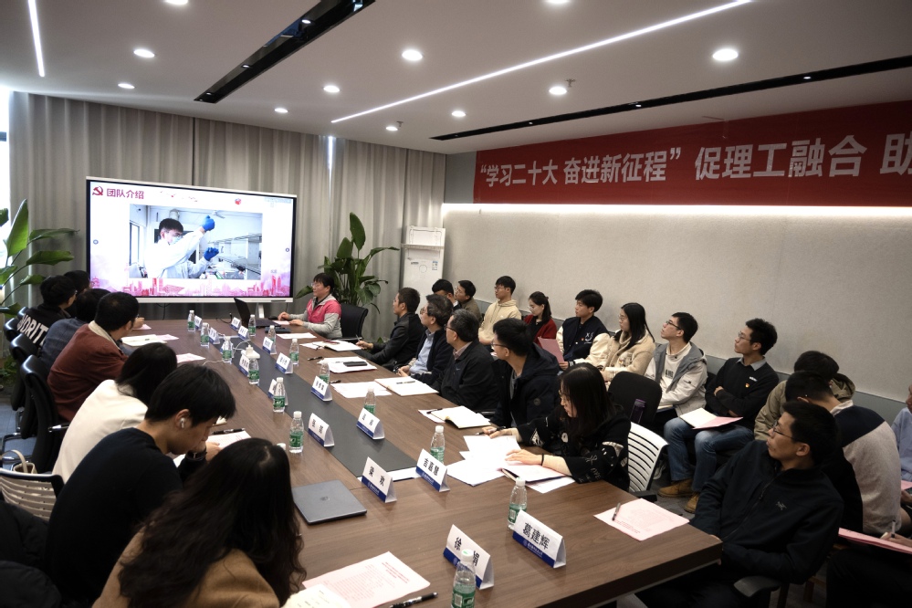 随后,“光电”党支部组宣委员沙树林进行了以“‘三位一体’推进教育科技人才现代化战略布局”为题的主题领学。“驭风”党支部学生党员潘睿丰进行了以“科技自立自强,勇当青年先锋”为主题的领学。双方支部党员就理论学习心得、实验海量数据分析、数据挖掘方法等展开了充分的交流研讨。