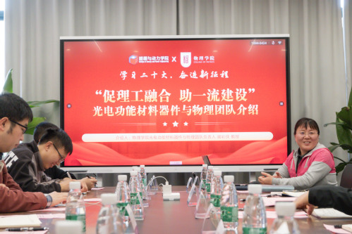 为深入学习贯彻党的二十大精神,不断提升基层党建工作水平,促进党建与业务工作深度融合,2023年3月28日,365上市公司光电功能材料器件与物理研究团队党支部与能源与动力学院驭风排风系统纵向党支部开展了以“促理工融合,助一流建设”为主题的联学共建活动。365上市公司副院长李晋斌,党委委员、“光电”党支部指导教师阚彩侠,能源与动力学院党委副书记樊小杰,副院长、“驭风”党支部指导教师徐惊雷,以及共建支部师生党员40余人参加本次活动。活动由“驭风”党支部教师党员吉嘉慧主持。