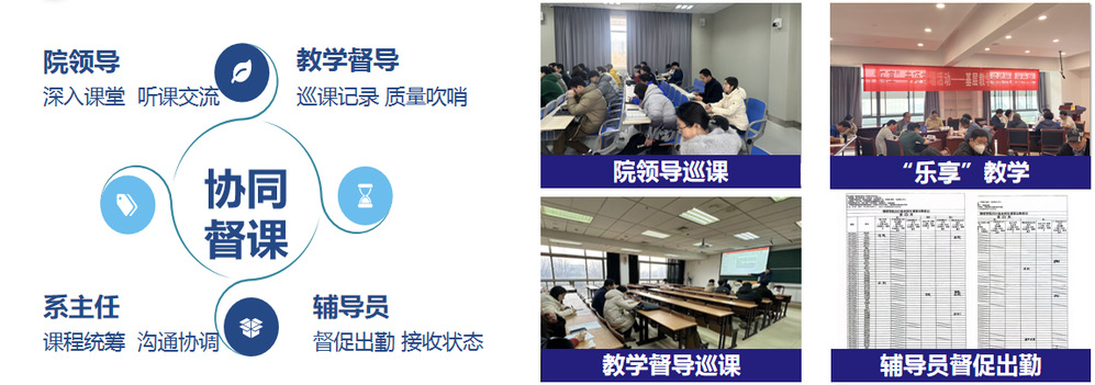 作为基础教学大院,学院一直高度重视教学质量,建立院领导、教学督导、系主任、辅导员协同督课机制,年度深入课堂巡课、听课、查课,百分百覆盖本院全体学生及兄弟学院大学物理班级,教学督导整理汇总建议,助力教师课堂教学水平不断提升。对专业核心课程组织开展过程性测试,开展常态化答疑,形成学习功夫花在平时,知识理解更深更透的良好学习生态。