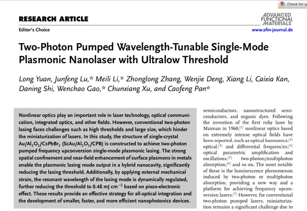 相关成果以“Two-Photon Pumped Wavelength-Tunable Single-Mode Plasmonic Nanolaser with Ultra-low Threshold”为题在线发表在顶级期刊《Advanced Functional Materials》上。硕士生袁龙为第一作者,卢俊峰副研究员为通讯作者,中国科学院北京纳米能源与系统研究所高文超青年研究员和北京航空航天大学潘曹峰教授为共同通讯作者。