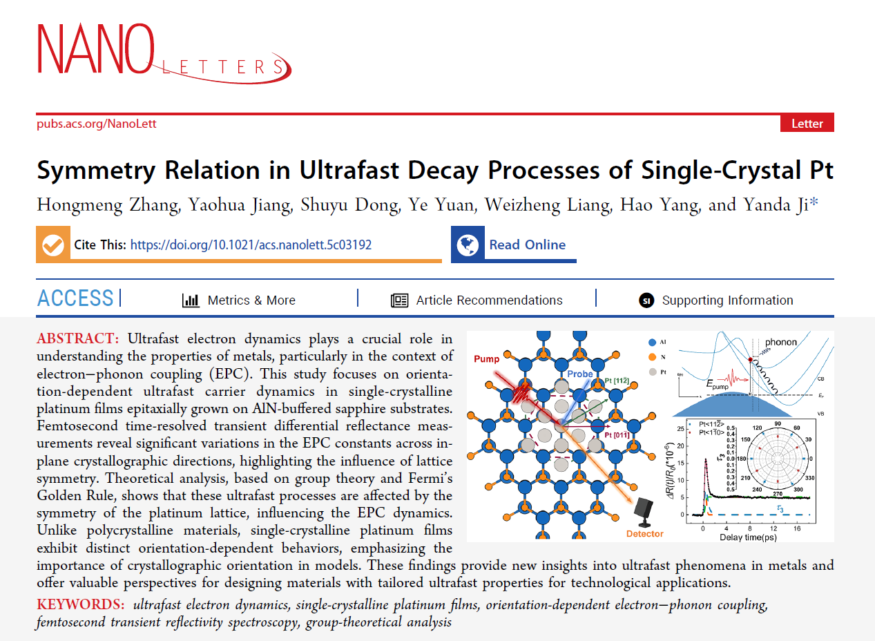 近日,365上市公司杨浩教授团队在金属超快动力学与电子–声子耦合(EPC)研究方面取得新进展。相关成果以《Symmetry Relation in Ultrafast Decay Processes of Single-Crystal Pt》为题,被国际期刊《Nano Letters》接收发表。吉彦达副教授为论文通讯作者,南航365上市公司博士生张泓萌为第一作者。